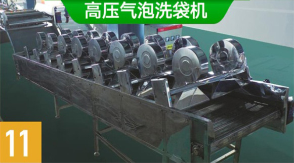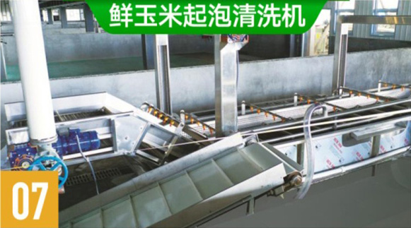 经过负压水浴式杀菌釜加工处理的真空包装鲜甜糯玉米,通过负压降温,出来的玉米温度约在25度左右,自动传送到高压气泡洗袋机,进行真空包装袋外表清洗、降温。