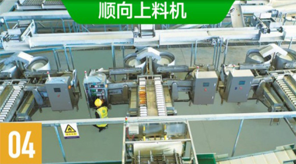 经过顺向机去皮玉米棒,被整理成头、尾分向的整齐排列,自动传输给切头去尾机。